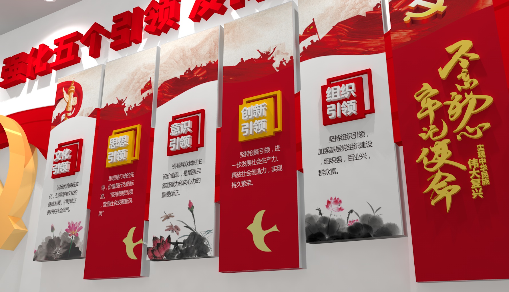 - 細(xì)節(jié)點(diǎn)綴:加入紅色元素小裝飾(如微型黨旗、黨章擺件、紅色書籍模型),企業(yè)展廳可結(jié)合行業(yè)特色(如電力企業(yè)加“黨建+安全用電”圖標(biāo),農(nóng)業(yè)企業(yè)加“黨建+鄉(xiāng)村振興”插畫)。